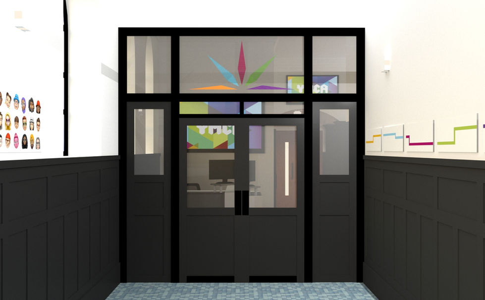 The final design features bright white walls that bounce off sunshine from the Grade II listed building’s arched windows. Charcoal wall panels add depth and hide imperfections as a result of scratches unavoidable by the high-traffic area. Corridors are kept wheelchair friendly by eliminating obstruction and providing low-level furniture. Simplicity in the form of colour choice and layout presents a clean space. Multicolour glass stickers and LCD displays remind the users that the hub welcomes youths and supports diversity.